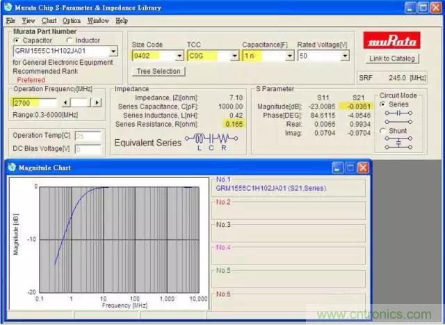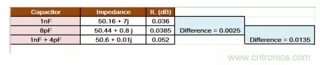 反之因为1nF 的SRF 较远离RF 频率的2700 MHz 所以阻抗偏移程度较大,所以阻抗偏移程度。不是光看电容值而是要由RF 频率跟电容SRF 的差距程度来决定,因为pF 等级电容的SRF 会较接近RF 频段亦即差距程度较小。